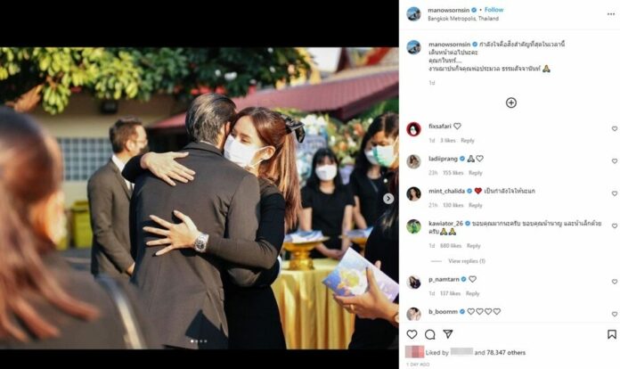 โดยสาวมะนาวโพสต์ภาพโมเมนต์มิตรภาพสวยงามขณะไปร่วมในงานฌาปนกิจคุณพ่อของหนุ่มตอง พร้อมสวมกอดให้กำลังใจอดีตแฟนหนุ่ม แคปชั่นส่งกำลังใจครั้งสำคัญว่า