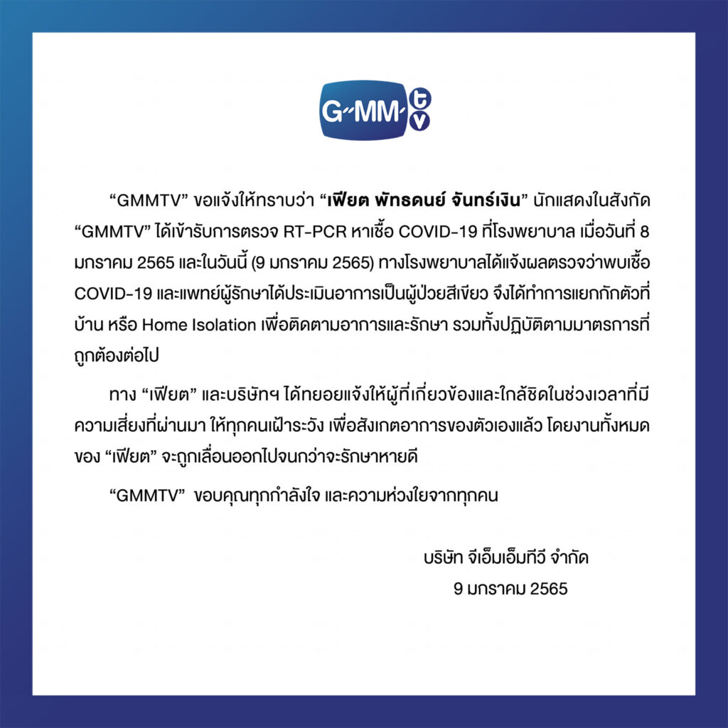 ทาง “เฟียต” และบริษัทฯ ได้ทยอยแจ้งให้ผู้ที่เกี่ยวข้องและใกล้ชิดในช่วงเวลาที่มีความเสี่ยงที่ผ่านมา ให้ทุกคนเฝ้าระวัง เพื่อสังเกตอาการตัวเองเเล้ว โดยงานทั้งหมดของ “เฟียต” จะถูกเลื่อนออกไปจนกว่าจะหายดี GMMTV ขอบคุณทุกกำลังใจ และความห่วงใยจากทุกคน”