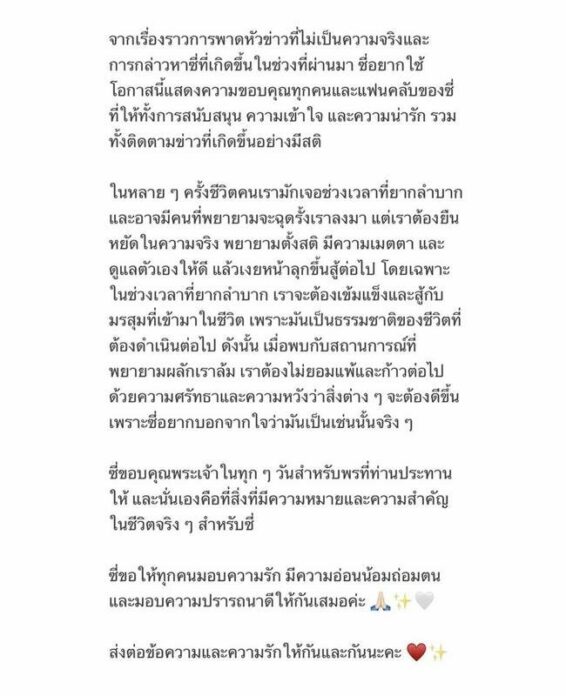 โดยมีเนื้อหาดังนี้ “จากเรื่องราวการพาดหัวข่าวที่ไม่เป็นความจริงและการกล่าวหาซี่ที่เกิดขึ้นในช่วงที่ผ่านมา ซี่อยากใช้โอกาสนี้แสดงความขอบคุณทุกคนและแฟนคลับของซี่ที่ให้ทั้งการสนับสนุน ความเข้าใจ และความน่ารัก รวมทั้งติดตามข่าวที่เกิดขึ้นอย่างมีสติ”