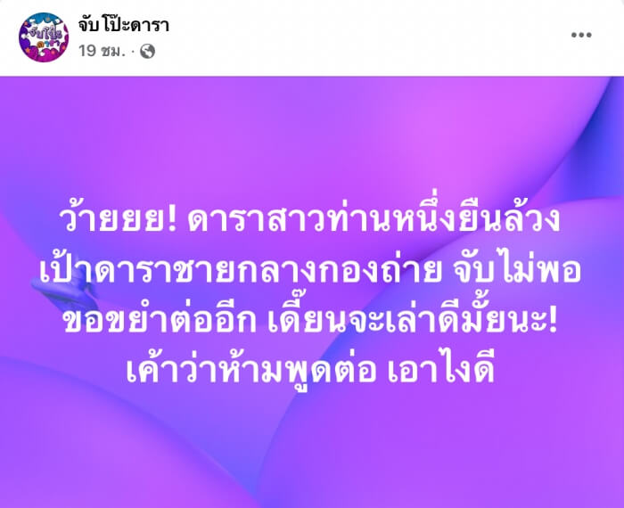 โดยเพจดัง ระบุข้อความว่า “ว้ายยย ! ดาราสาวท่านหนึ่งยืนล้วงเป้าดาราชายกลางกองถ่าย จับไม่พอขอขยำต่ออีก เดี๊ยนจะเล่าดีไหมนะ ! เขาว่าห้ามพูดต่อ เอาไงดี”