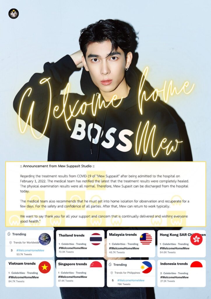 อย่างไรก็ตามทันทีที่ทราบข่าว แฟนคลับทั่วโลกต่างดีใจและร่วมกันติด #WelcomeHomeMew เพื่อเป็นการส่งกำลังใจอย่างล้นหลามให้ มิว ศุภศิษฏ์ ได้รับรู้ถึงความห่วงใยที่ทุกคนเฝ้ารอวันที่ มิว ศุภศิษฏ์ หายป่วย งานนี้เล่นเอาทวิตเตอร์กลับมาคึกคักอีกครั้ง และ #WelcomeHomeMew ก็ทะยานขึ้นสู่อันดับ 1 เทรนด์ไทย, อันดับ 3 เทรนด์โลก และยังติดเทรนด์อันดับ1ในอีกหลายโลเคชั่นทั่วโลก อาทิเช่น Hong Kong, Malaysia, Singapore, Vietnam