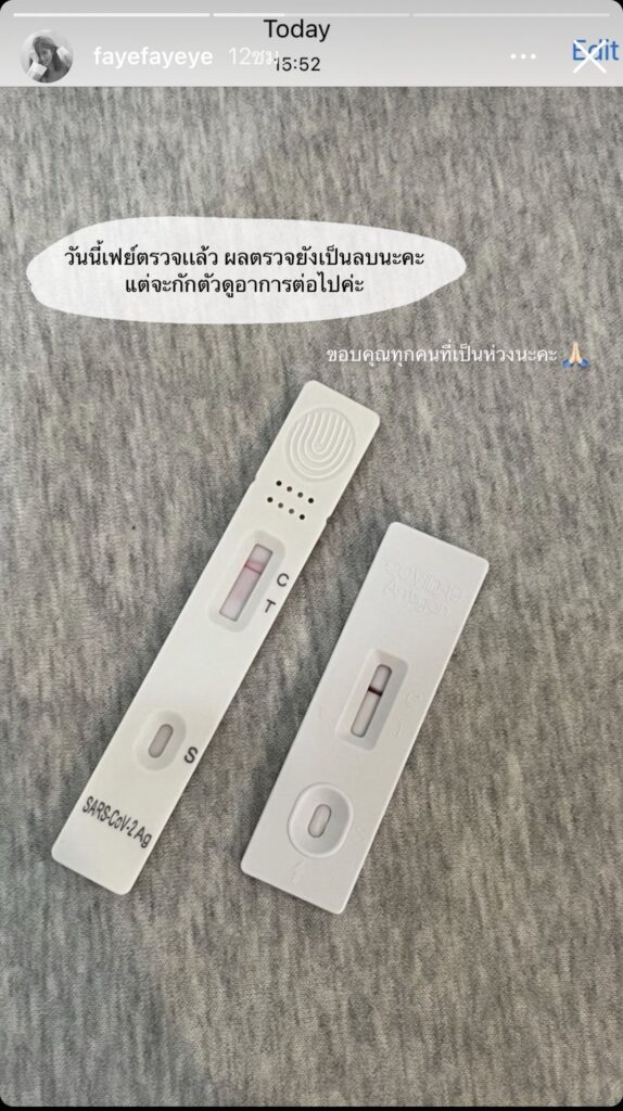 ล่าสุดทางด้านของสาวคนสนิท “เฟย์ พรปวีณ์” เองก็ได้มีการเคลื่อนไหวผ่านไอจีสตอรี่ โชว์ผลตรวจ ATK ยังเป็นลบ พร้อมกับบอกว่า “วันนี้เฟย์ตรวจแล้ว ผลตรวจยังเป็นลบนะคะ แต่จะกักตัวดูอาการต่อไปค่ะ ขอบคุณทุกคนที่เป็นห่วงนะคะ”