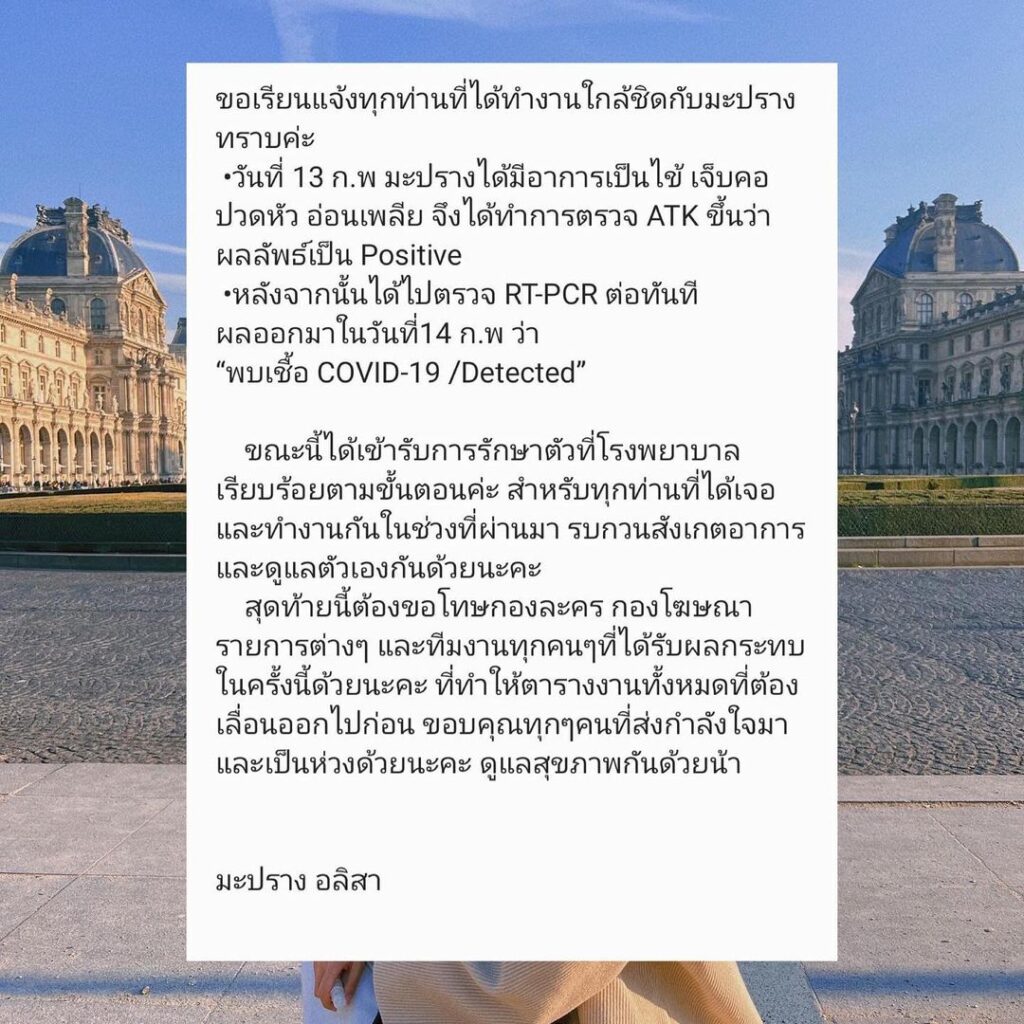 ออกมาแจ้งข่าวผ่านอินสตาแกรมส่วนตัวหลังผลตรวจยืนยันติดเชื้อคิด-19 อีกราย สำหรับนักแสดงสาว “มะปราง อลิสา” หลังจากพบว่ามีอาการปวดหัว เจ็บคอ อ่อนเพลีย และเป็นไข้