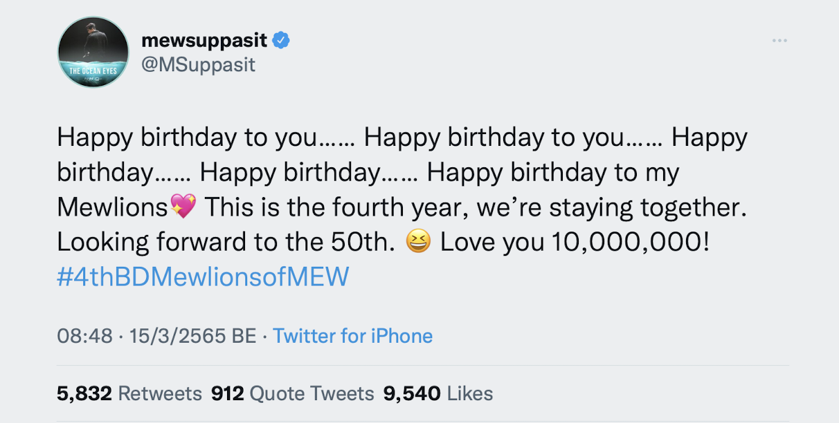 และเนื่องในโอกาสความรักที่ยาวนานทำให้เหล่า Mewlions (อ่านว่า มิวเลี่ยนส์) จุดแฮชแท็ก #4thBDMewlionsofMEW ฉลองให้กับพลังทัพของ มิว ศุภศิษฏ์ ก็ได้มีอายุครบ 4 ขวบในวันนี้อย่างสนุกสนาน