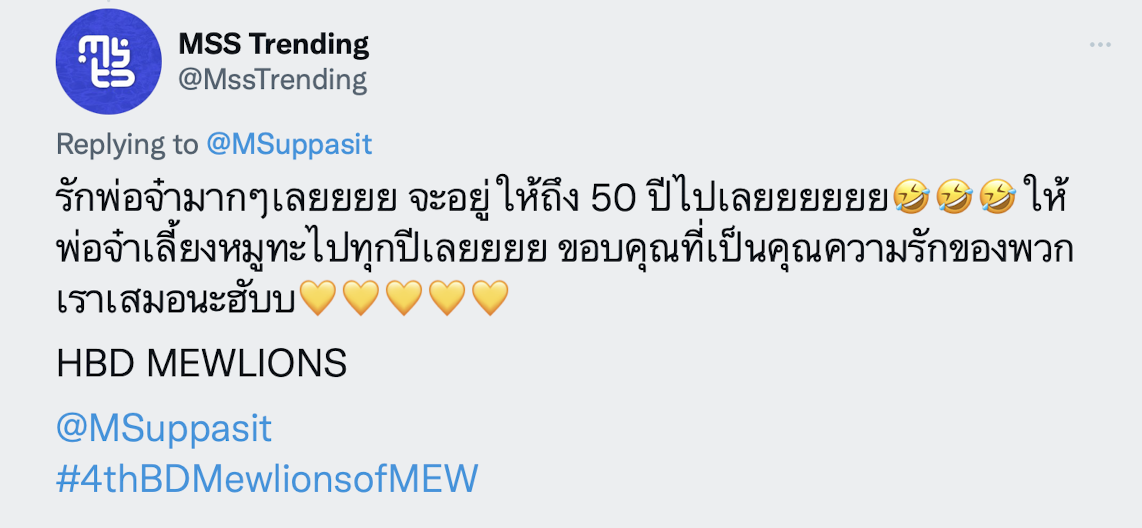 เต็มไปด้วยข้อความแสดงความยินดี ข้อความอวยพร รวมถึงการส่งต่อความน่ารักระหว่างแฟนคลับและศิลปินว่าจะอยู่ต่อไปแบบนี้ ไปเรื่อยๆจนแก่ โดยพ่อมิวก็ร่วมแสดงความยินดีด้วยเหมือนกันเพลง Happy birthday to my Mewlions โดยเฉพาะเลย