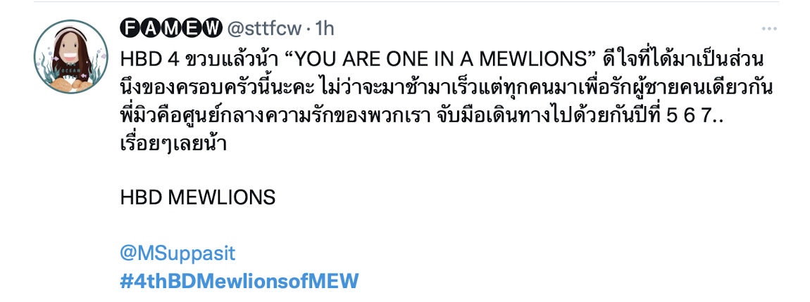 ฉลองให้กับ 4 ปีแห่งความคลั่งรักของ Mewlions แฟนคลับตัวจี๊ดของ มิว ศุภศิษฏ์ ที่เอนเนอร์จี้ไม่เคยแผ่ว สร้างตำนานบนโลกโซเชียลไม่แพ้ศิลปินในดวงใจบน #4thBDMewlionsofMEW