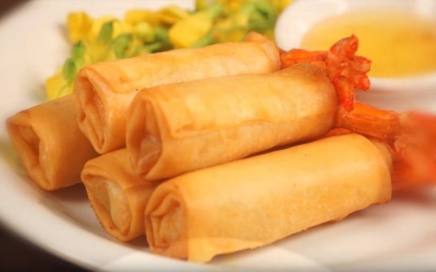 3. ตัดแป้งปอเปี๊ยะเป็นสองส่วน แล้วจึงตัดเป็นรูปสี่เหลี่ยมผืนผ้า วางกุ้งลงตรงกลางแผ่นแป้งม้วนให้หางกุ้งโผล่ออกมา ติดด้วยแป้งเปียกให้สนิท
