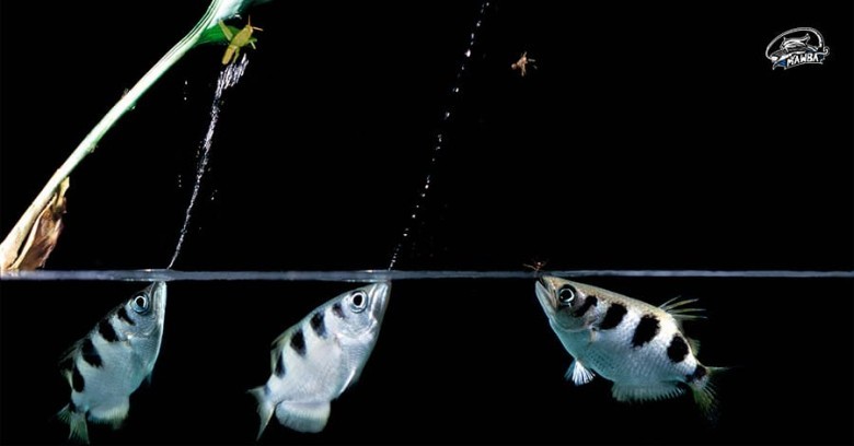 อาหาร ขมังธนูกินแมลงที่บินอยู่ตามผิวน้ำ แมลงน้ำ ลูกกุ้ง ลูกปลาและลูกน้ำ