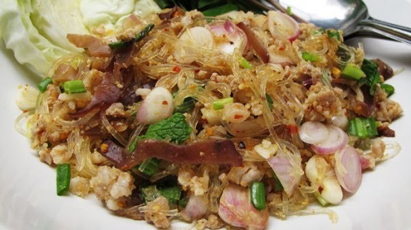 3. ใส่หมูสับที่รวนสุกไว้ลงไป ตามด้วยเครื่องปรุงต่างๆ เมื่อได้รสชาติที่ถูกใจแล้วก็ใส่ต้นหอม ผักชี ใบสะระแหน่ลงไป คลุกให้เข้ากันตักใส่จาน