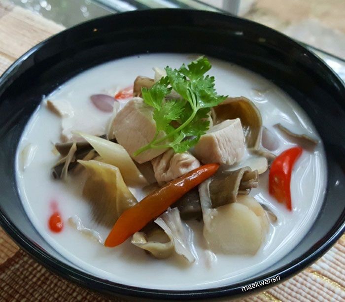 - ข่าหั่นเป็นชิ้น/ตะไคร้หั่นเป็นชิ้น/หอมแดงบุบ/ใบมะกรูดฉีก