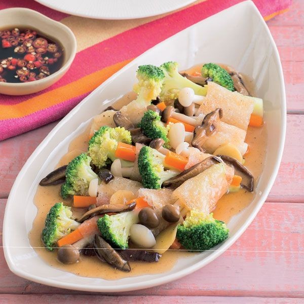 วิธีทำ เยื่อไผ่น้ำแดงเจ1. ต้มน้ำเปล่าพอเดือด นำแครอท เห็ดชิเมจิทั้ง 2 สี และบรอกโคลียัดใส่เยื่อไผ่ให้สวยงาม นำไปลวกพอสุก ตักขึ้นให้สะเด็ดน้ำ ใส่ภาชนะ พักไว้