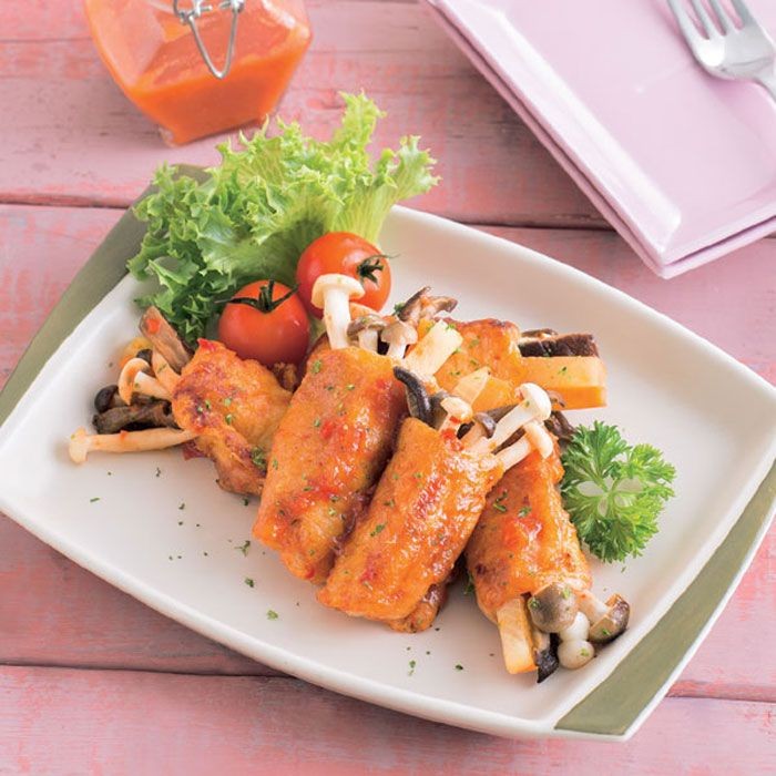 2. หั่นเต้าหู้ให้เป็นแนวยาว ทาส่วนผสมซอสบาร์บีคิว วางแครอทหั่นแท่ง สับปะรดหั่นแท่ง เห็ดหอม เห็ดชิเมจิทั้ง 2 สี ม้วนเต้าหู้ให้สวยงาม ใช้ไม้จิ้มฟันกลัดให้แน่น