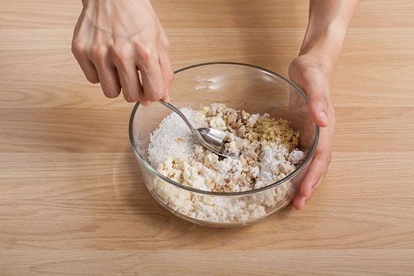 เคล็ดลับความอร่อย : แป้งสาลีจะช่วยให้ส่วนผสมเหนียวและจับตัวกันง่ายขึ้น เมื่อนำไปยัดไส้ฟองเต้าหู้แล้วจะได้เป็นทรงสวย ไม่แตกออกจากกัน