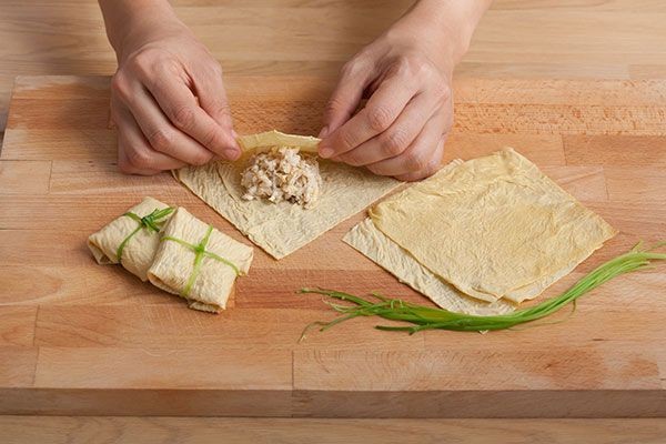 2. จากนั้นลงมือห่อฟองเต้าหู้ โดยวางฟองเต้าหู้ลงบนเขียงตามแนวเฉียง ตักไส้ประมาณ 1 ช้อนโต๊ะ วางลงบนฟองเต้าหู้ตรงกลาง
