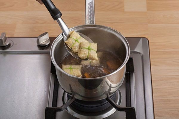 4. จัดห่อฟองเต้าหู้ยัดไส้ใส่จาน นำไปนึ่งประมาณ 5 นาทีจนสุก เพื่อให้ฟองเต้าหู้อยู่ตัวไม่คลายออกมาเวลานำไปต้ม