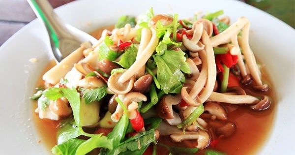 3. ใส่น้ำลงในหม้อ นำขึ้นตั้งไฟจนเดือด ใส่เห็ดทั้งหมดลงลวกจนสุก ตักขึ้นสะเด็ดน้ำจนแห้ง ใส่ลงในส่วนผสมน้ำยำ เคล้าผสมให้เข้ากันเบา ๆ ชิมรสตามชอบ ตักใส่จาน