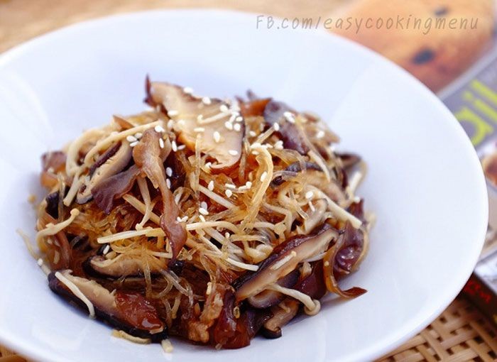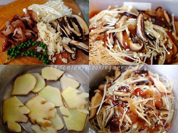 - เห็ดหอม (แช่น้ำให้นิ่มหั่นเป็นเส้น) 3 ดอก