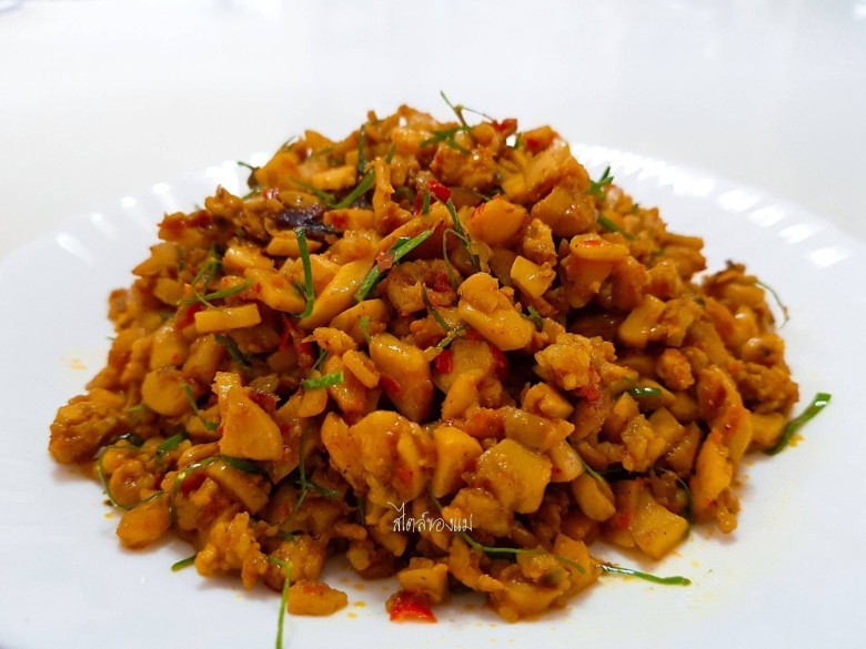 3. ผัดพอได้ที่แล้วนำโปรตีนเกษตรที่ทอดไว้มาคลุกเคล้า และคั่วต่อด้วยไฟอ่อน ๆ จนแห้งในแบบที่ชอบ โรยใบมะกรูดซอย ปิดไฟ ตักใส่จาน เสิร์ฟคู่กับผักสดตามชอบ
