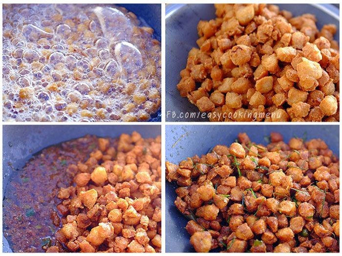 1. ทอดโปรตีนเกษตรในน้ำมันร้อน (เอาลงทอดกระทะพอน้ำมันดังฟู่ คนให้ทั่ว จากนั้นนับ 1-3 ให้ตักขึ้นทันที จะทำให้กรอบและหอมมากขึ้น)