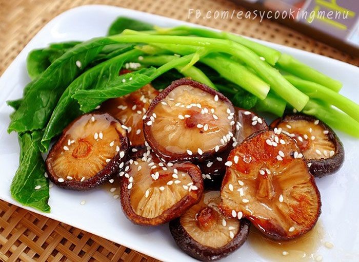 4. นำคะน้าลงลวกในน้ำร้อนพอสุกแล้วนำไปน็อกในน้ำเย็นเพื่อคงสีสัน จากนั้นนำไปวางในจานเสิร์ฟ ข้าง ๆ เห็ดหอม ราดด้วยน้ำราดหน้า โรยงาขาวคั่ว พร้อมเสิร์ฟ