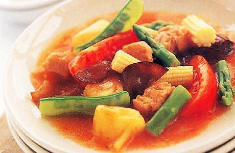 - ใส่น้ำมันในกระทะ ตั้งไฟให้ร้อน ใส่น้ำซุป พริกไทยน้ำตาลทราย น้ำมันเห็ดหอม เกลือ ซีอิ้วขาว ซอสมะเขือเทศคนให้เข้ากัน พอเดือดละลายแป้งมันกับน้ำใส่ คนพอข้น ตักราดบนมะเขือเทศ แต่งด้วยใบขึ้นฉ่าย พร้อมเสิร์ฟ