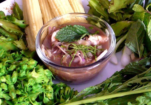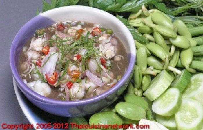 3. ตักใส่ถ้วย เสิร์ฟพร้อมผักสด เช่น แตงกวา ขมิ้นขาว ถั่วพู มะเขือเปราะ ถั่วฝักยาว