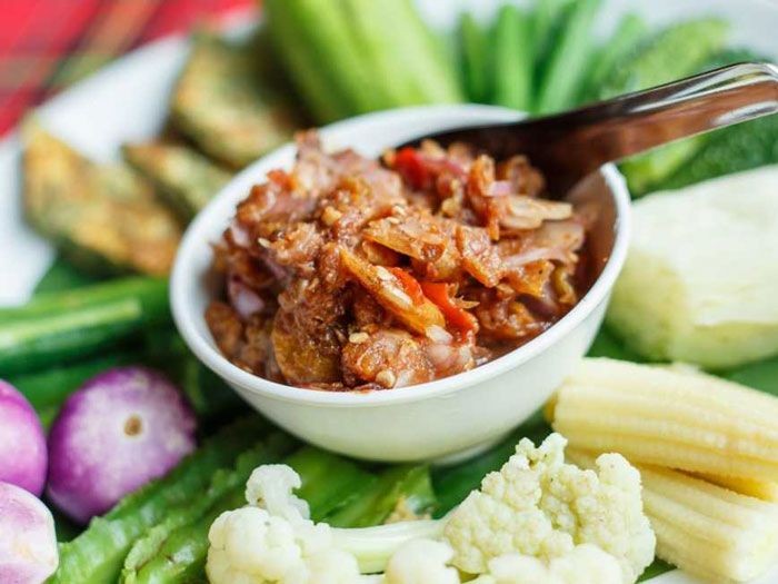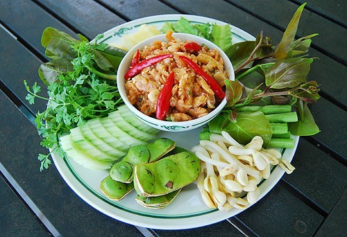 4. จัดเสิร์ฟพร้อมผักสด เช่น มะเขือเปราะ แตงกวา ถั่วฝักยาว หรือผักต้ม เช่น ดอกกะหล่ำ แครอท