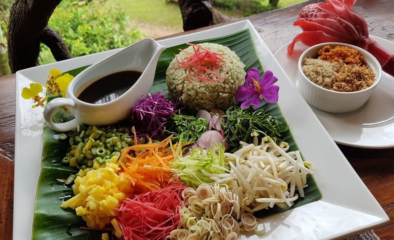 2. วิธีจัดเสิร์ฟ ตักข้าวสวยใส่จานเล็กน้อย ใส่มะพร้าวคั่ว กุ้งแห้งป่น ผักทีละอย่างอย่างละเล็กน้อย ราดด้วยน้ำบูดู โรยพริกป่น ปรุงรสด้วยมะนาวหั่นเสี้ยว
