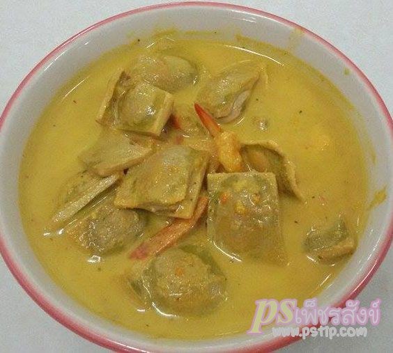 3.นำหม้อตั้งไฟ ใส่กะทิลงไป ผสมเครื่องแกงเผ็ดและกะปิให้เข้ากัน ละลายลงไปในน้ำกะทิ รอจนเดือด