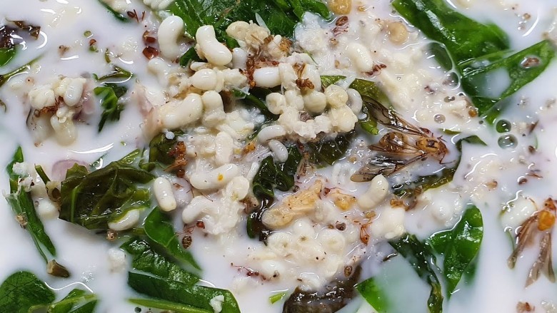 - เมื่อกะทิเดือดปรุงรสด้วยเกลือป่นและผงชูรส เสร็จแล้วใส่ไข่มดแดงลงไป รอเดือดอีกครั้งยกลง เสิร์ฟได้เลย