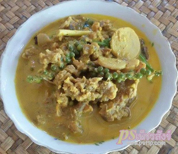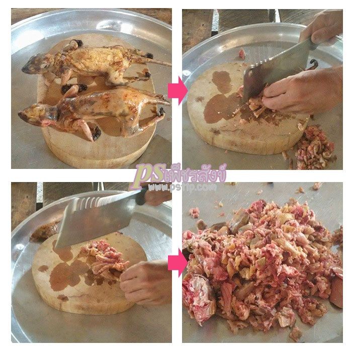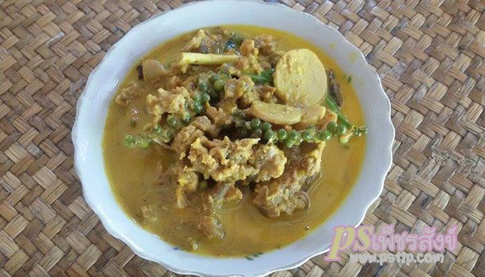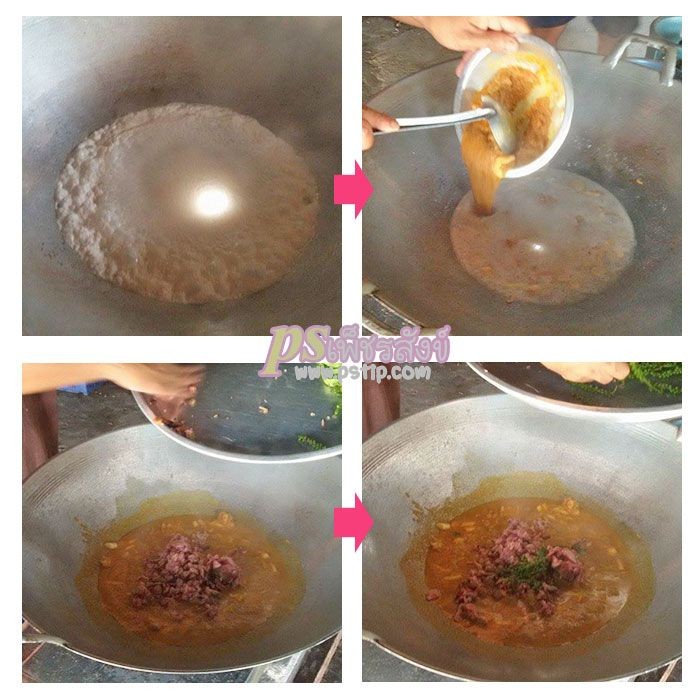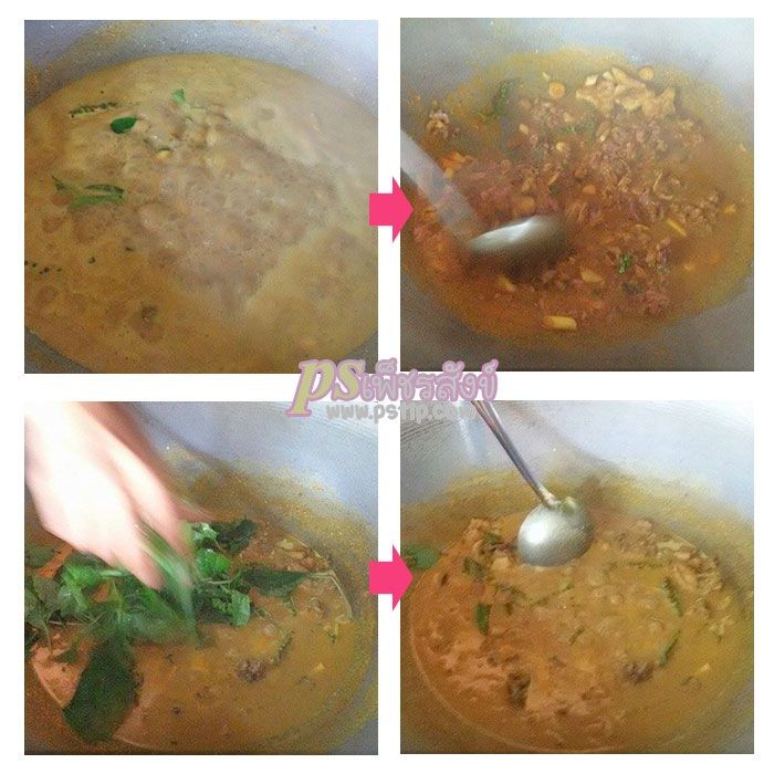 3.เมื่อกะทิเดือดแล้วให้ใส่เนื้อกระรอกสับลงไปรวนพอสุก เมื่อน้ำแห้งก็ให้เติมกะทิลงไปทีละนิดเรื่อยๆ จากนั้นให้ใส่ข่า หน่อปุดนาลงไป