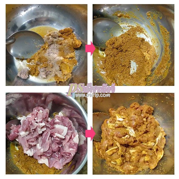 2.นำเครื่องแกงเผ็ดใต้กับกะปิมาผสมรวมกันใส่น้ำเปล่าลงไปเล็กน้อย เพื่อให้เครื่องแกงกับกะปิผสมเข้ากันง่ายขึ้น จากนั้นใส่เนื้อหมูที่หั่นไว้แล้วลงไปคลุกเคล้าให้เข้ากัน หมักทิ้งไว้ประมาณ 10-20 นาที