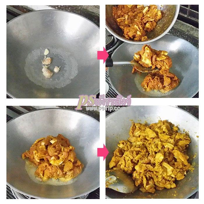 3.นำกระทะตั้งไฟปานกลาง ใส่น้ำเปล่าลงไปเล็กน้อย ตามด้วยกระเทียมบุบ เมื่อน้ำเริ่มเดือดจึงใส่เนื้อหมูที่หมักไว้ลงไปรวนจนสุก หากรู้สึกว่าน้ำแห้งไปก็ใส่น้ำเปล่าลงไปได้เรื่อยๆ พอให้มีน้ำขลุกขลิก
