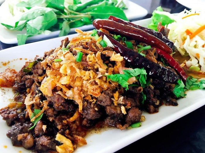 4. ตวงน้ำมันใส่กระทะตั้งไฟพอร้อน ใส่กระเทียมลงเจียวพอเหลือง ใส่ส่วนผสมทั้งหมดลงผัดจนกระทั่งสุก ปรุงรสด้วยน้ำปลา ชิมรสตามชอบ ใส่ต้นหอม ผักชี ผักชีฝรั่ง ผักไผ่ ใบมะกรูด ผัดให้เข้ากันอีกครั้ง ตักขึ้นใส่จาน
