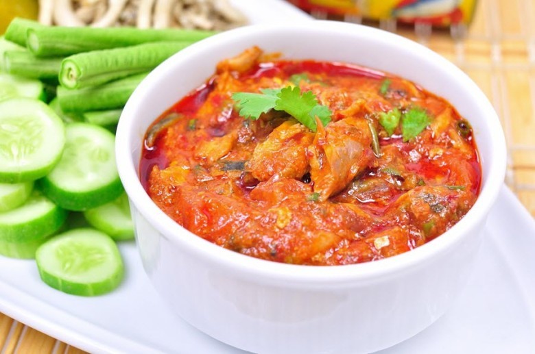 4. ตวงน้ำมันใส่กระทะตั้งไฟพอร้อน ใส่เครื่องที่โขลกลงผัดจนกระทั่งสุก ปรุงรสด้วยน้ำปลา ตักใส่ภาชนะ โรยด้วยต้นหอม ผักชี รับประทานกับผักสดและผักต้มชนิดต่างๆ