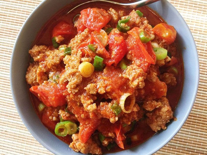 3. หั่นมะเขือเทศเป็นชิ้นเล็กๆ ผสมกับเนื้อหมูให้เข้ากัน นำไปโขลกกับส่วนผสมเครื่องแกงให้เข้ากัน
