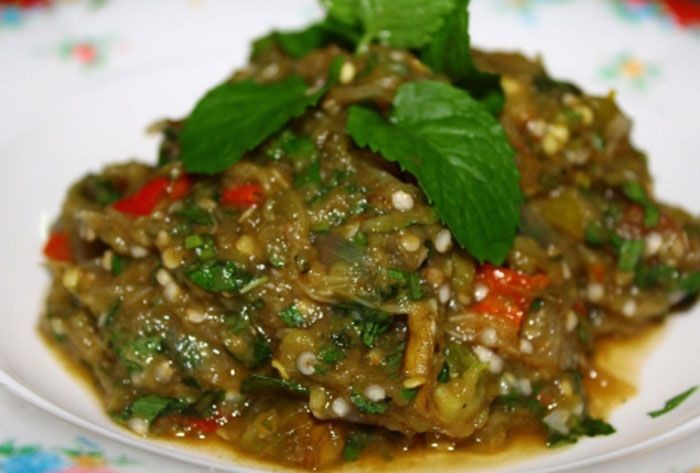 3. ตวงน้ำมันใส่กระทะ ตั้งไฟพอร้อนใส่กระเทียม เจียวจนมีกลิ่นหอม ใส่ส่วนผสมที่โขลกไว้ลงผัด ปรุงรสด้วยน้ำปลา ชิมรสตามชอบ ใส่ต้นหอม ผักชี ตักขึ้น โรยหน้าด้วยใบสะระแหน่และใบโหระพา