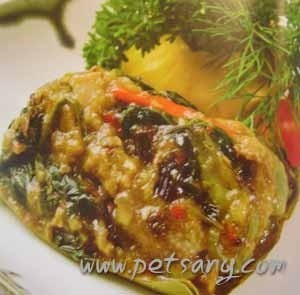 3. ผสมเนื้อไก่กับน้ำพริกแกงที่เตรียมไว้ ใส่ผักกวางตุ้ง มะเขือยาว พริกชี้ฟ้าแดง ใบมะกรูด คลุกให้เข้ากัน ตักใส่ใบตอง พับซ้าย ขวาเข้าหากันตามยาว แล้วจึงพับหัวท้าย กลัดด้วยไม้กลัด นำไปย่างไฟจนกระทั่งสุก