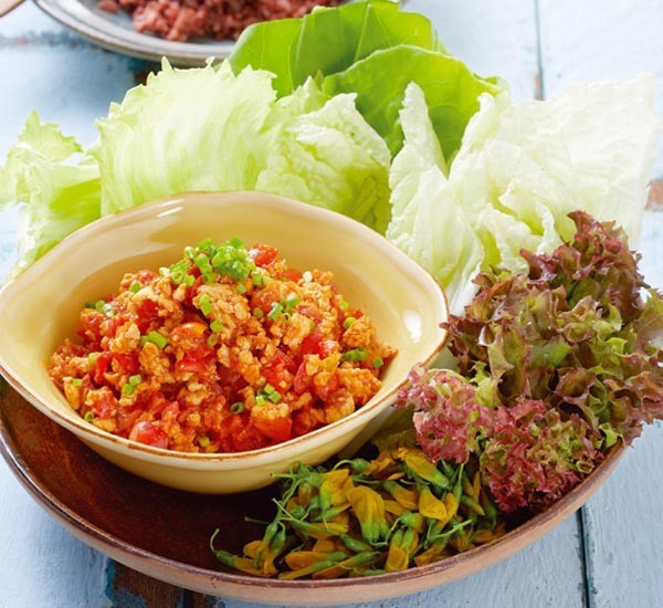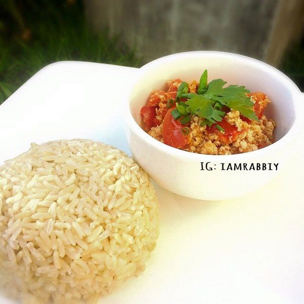 4. ใส่มะเขือเทศลงไปผัดจนเกือบเละ ปรุงรสด้วยเกลือ น้ำมะขามเปียก และน้ำหวานดอกมะพร้าวเล็กน้อย จัดเสิร์ฟพร้อมข้าวกล้องกับผักสด