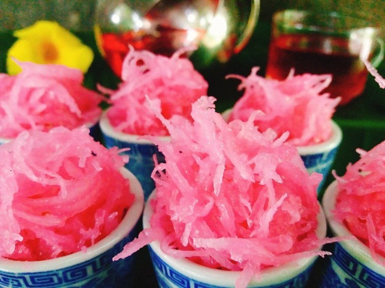 วิธีทำ ขนมเกสรชมพู่ นำส่วนผสมทั้งหมด ใส่กะทะทองแดง แล้วกวนให้เข้ากันจนเริ่มเหนียวเล็กน้อย กวนเข้ากันได้ที่แล้ว ยกลงจากเตา จะปั้นเป็นรูปวงรียาวประมาณ 4 นิ้วหัวท้ายแหลม
