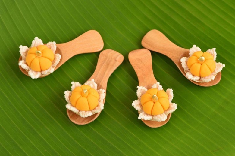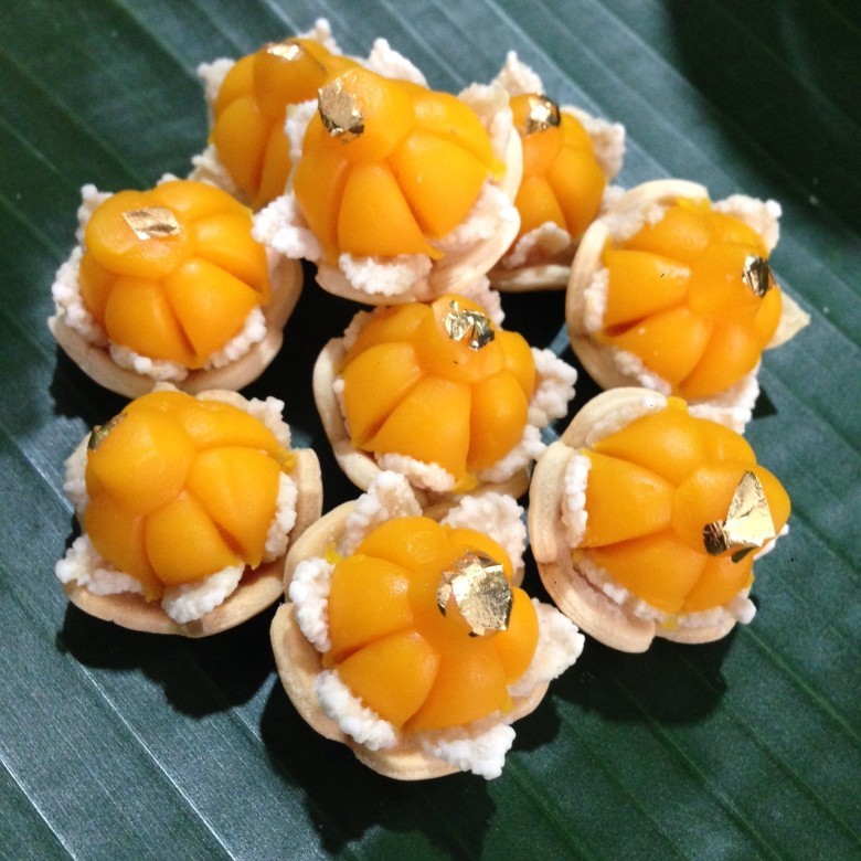 - นำทองเอกที่ปั้นไว้วางลงตรงกลางจานรองขนมที่มีเม็ดแตงวางโดยรอบ แต่งหน้าบนด้วยขนมทองเอกปั้นเป็นลูกกลมเล็กๆ ใช้ทองคำเปลว ตัดเป็นสี่เหลี่ยมเล็กๆ แกะตรงยอดมองเห็นเหมือนมงกุฎ