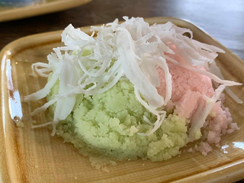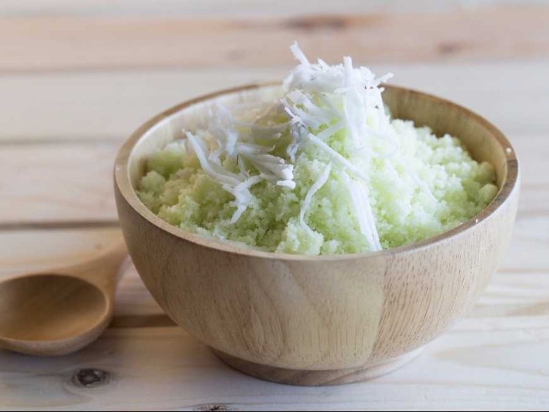 - เสิร์ฟกับมะพร้าวทึนทึกขูดฝอยเป็นเส้นๆ
