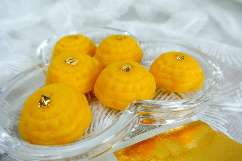 - นำแป้งมาปั้นเป็นก้อนกลมเท่า ๆ กัน อัดลงในพิมพ์รูปต่าง ๆ ตามต้องการ เคาะออก นำมาติดทองคำเปลว