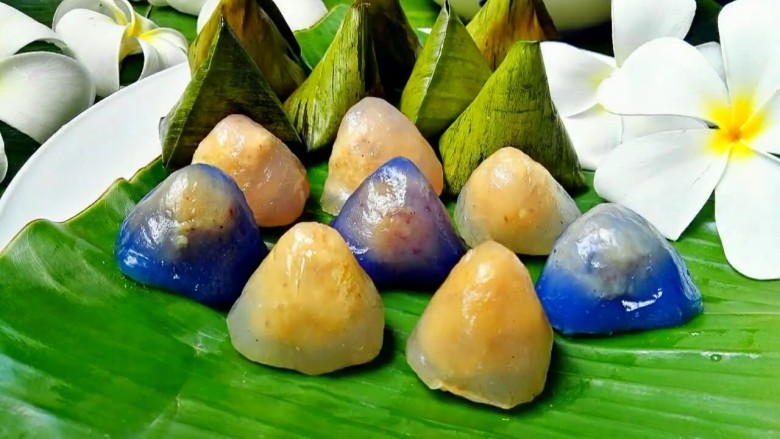 - นำใบตองที่พับไว้มาเปิดออก ตักแป้งใส่ 1 ช้อนชา แล้วใส่ถั่วที่ปั้นไว้เป็นไส้ 1 ลูก แล้วตักแป้งใส่อีก 1 ช้อนชา (หรือตักที่เดียว 2-3 ช้อนชา แล้วกดไส้ถั่วให้จมลงไป) แล้วพับริมห่อเข้ามาทั้งสองข้าง ให้ตรงกัน แล้วพับทาบอีกสองข้างเข้ามา ใช้คลิบๆ ให้เรียบร้อย