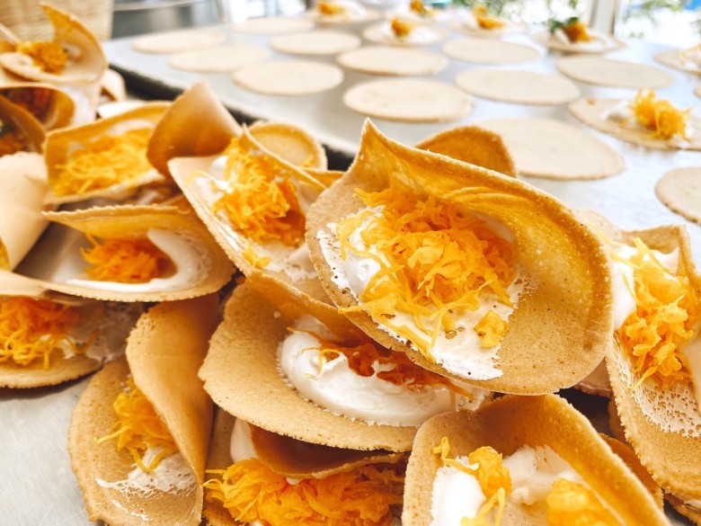 - จากนั้นจึงเลือกว่าจะใส่ไส้เค็มหรือไส้หวาน เมื่อใส่ไส้เสร็จแล้ว รอสักพักจนขนมสุกจึงพับครึ่งแล้วแซะใส่ถาด หรือจัดใส่จานเสิร์ฟ