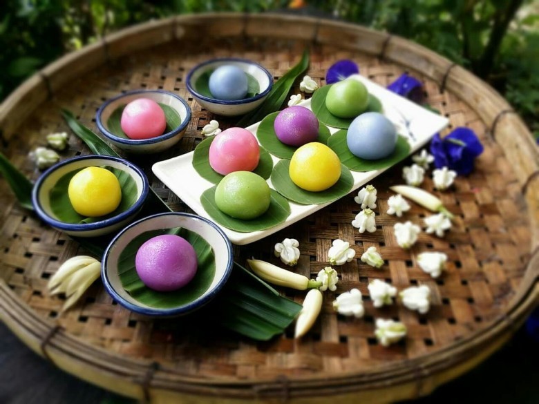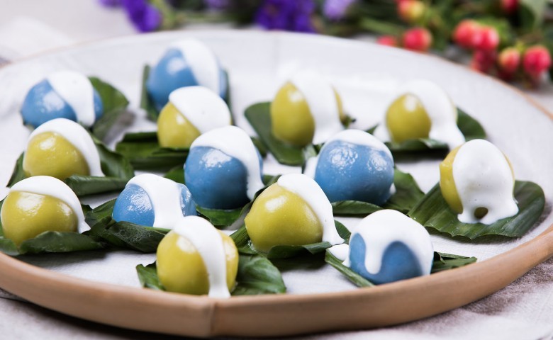 - ผสมแป้งกับน้ำคั้นใบเตย โดยค่อยๆใส่น้ำทีละนิด จนแป้งรวมตัวกันดี แต่ไม่แฉะ นวดจนกระทั่งแป้งเนียนนุ่ม