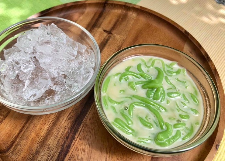 - ทำตัวลอดช่องโดยผสมแป้งข้าวเจ้า, แป้งเท้ายายม่อม, แป้งซ่าหริ่ม เข้าด้วยกัน หลังจากนั้นค่อยๆใส่น้ำ ปูนใสทีละน้อย ขณะเดียวกันก็นวดแป้งให้เข้ากันจนเนียนและเหนียว และค่อยๆใส่น้ำปูนใสจนหมด แล้วจึงใส่น้ำ ใบเตย แล้วนำไปตั้งบนไฟร้อนปานกลาง กวนจนแป้งเหนียวและข้นจึงลดไฟลง กวนต่อจนแป้งสุก (แป้งจะมี ลักษณะข้นเหนียว)จึงปิดไฟ