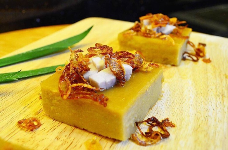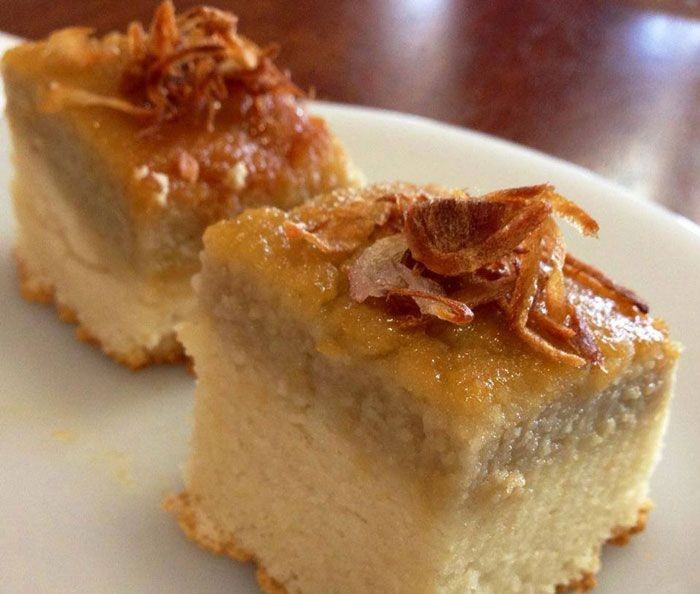 3. ใส่เผือกที่บดลงไปในส่วนผสม ตามด้วยแป้งข้าวเจ้าแล้วคนให้เข้ากัน เทส่วนผสมลงในถ้วยหรือถาดนำเข้าเตาอบ อุณหภูมิ 200 องศาเซลเซียสประมาณ 25 - 30 นาที หรือจนกระทั่งสุกเหลืองนำออกมาโรยหน้าด้วยหอมเล็กเจียว