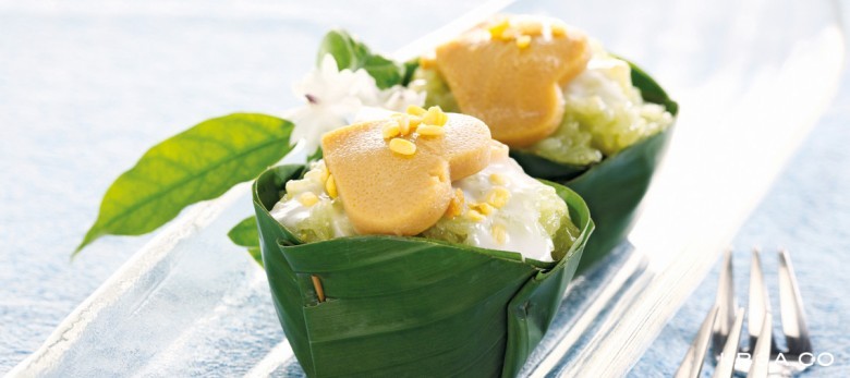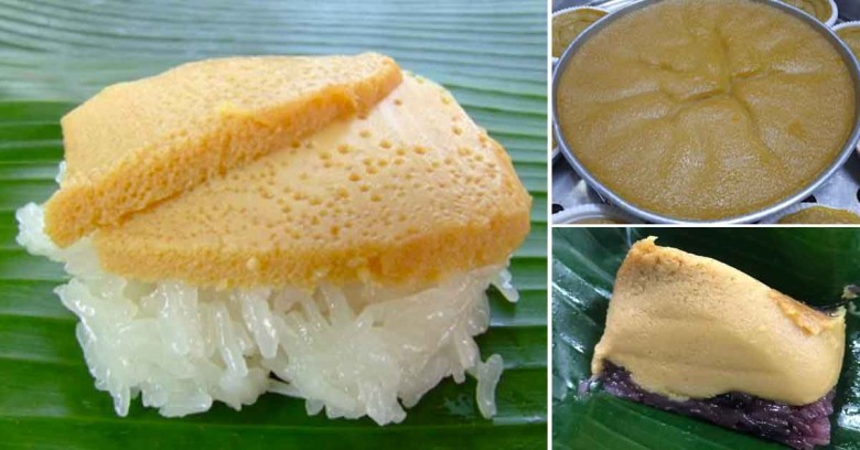 2. ผสมน้ำตาล กะทิ และไข่ ขยำกับใบตองหรือใบเตย แล้วกรองใส่ถาด นึ่งไฟแรง 25-30 นาที สุกยกลง
