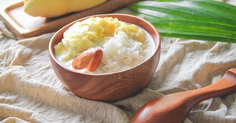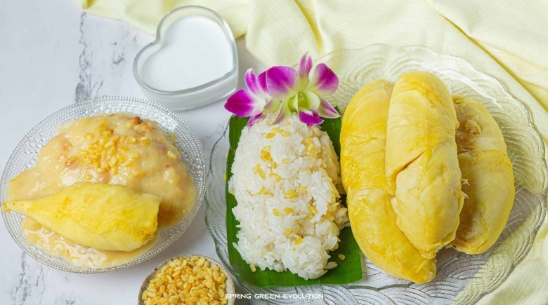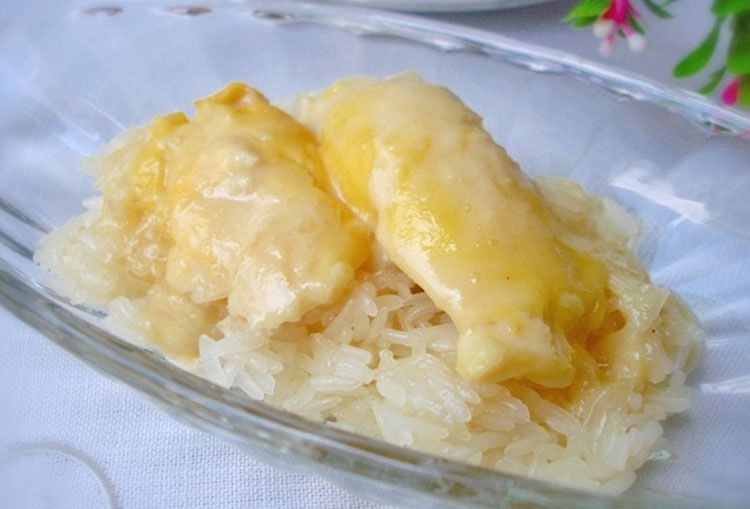 - ผสมกะทิกับน้ำตาลทราย และเกลือป่นในอ่างผสม เทข้าวเหนียวที่นึ่งสุกแล้วลงไป คนผสมจนเข้ากัน พักทิ้งไว้ 30 นาที จนข้าวเหนียวระอุ เตรียมไว้กินคู่กับน้ำกะทิทุเรียน